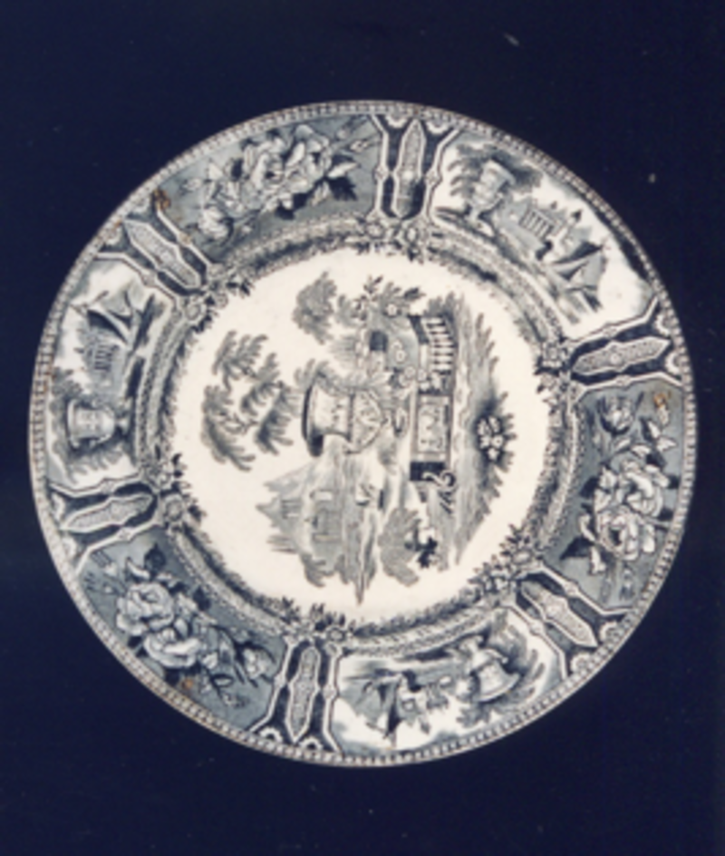 Prato sopeiro de bordo liso. Decoración estampada en negro.
