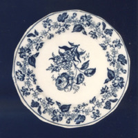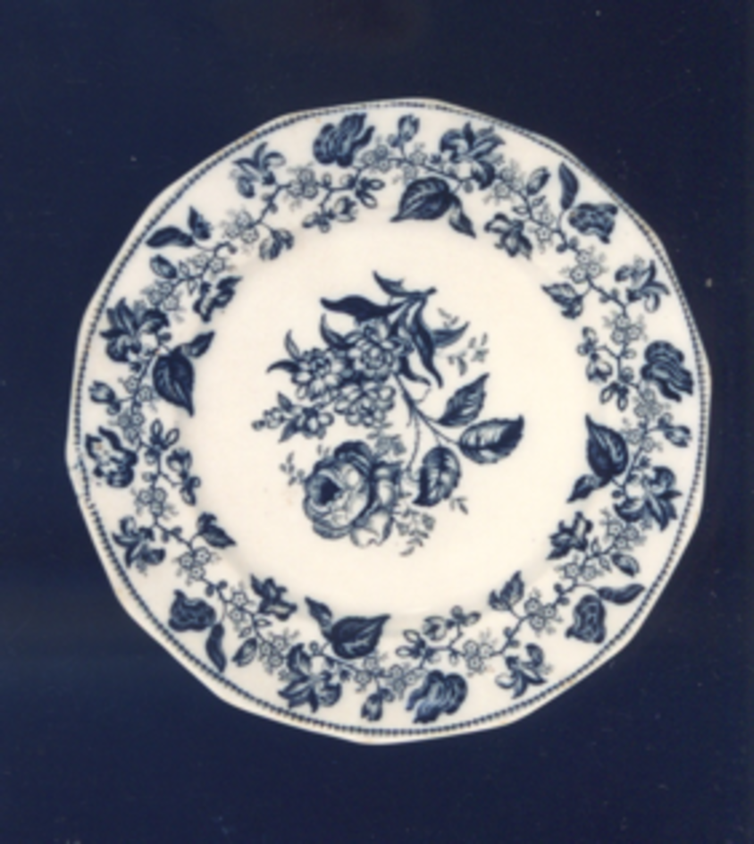 Prato de sobremesa con bordo poligonal e estampaxes en azul cobalto.