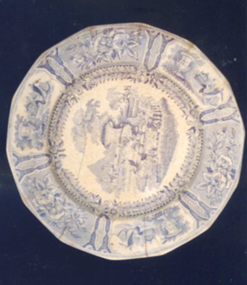 Prato chairo de bordo poligonal decorado por estampaxe en cor lila.