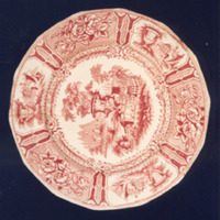 Prato de sobremesa de bordo poligonal con decoración estampada en rosa.