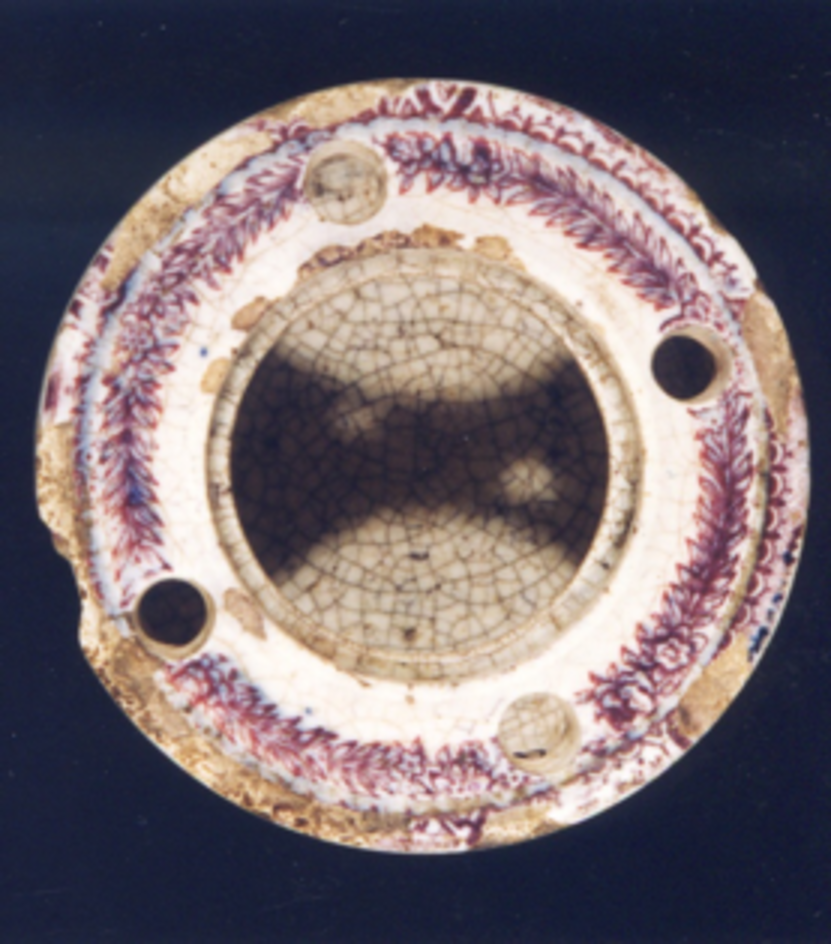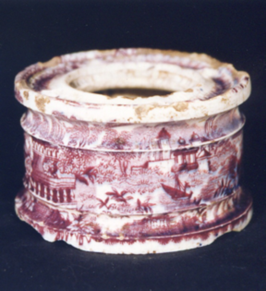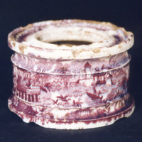 Tinteiro de forma cilíndrica moldurada, decorado con estampaxes en cor violeta.