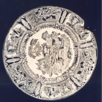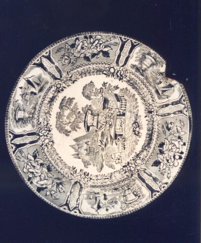 Prato de sobremesa de bordo liso e decoración estampada en negro.