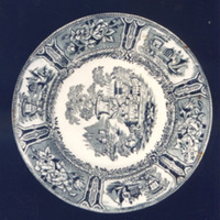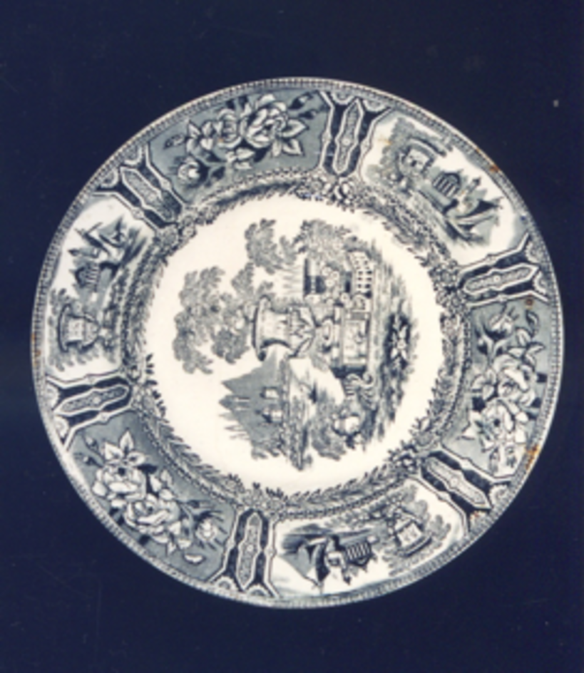 Prato sopeiro de bordo liso e decoración estampada en negro.