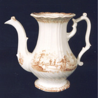 Cafeteira labrada con bordo de ondas e relevos en hélice. Decoración estampada en marrón. Tema principal: consiste nunha viñeta con paisaxe fantástica que se repite dúas veces no bandullo (un fragmento deste tema no vertedor). Composición en zig-zag que se organiza en torno a un río. Unha ponte une as dúas vertentes e sobre el dous pescadores coas súas canas. Bordeando o río e afastándose, torres, vexetación.