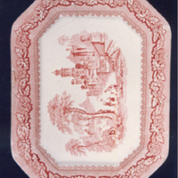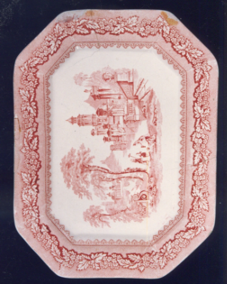 Fonte cuadrilonga chaira con estampaxes en rosa.