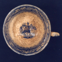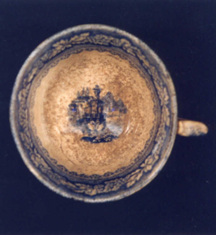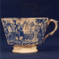 Cunca de té de forma troncocónica con decoración estampada en azul.