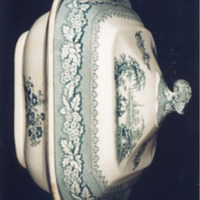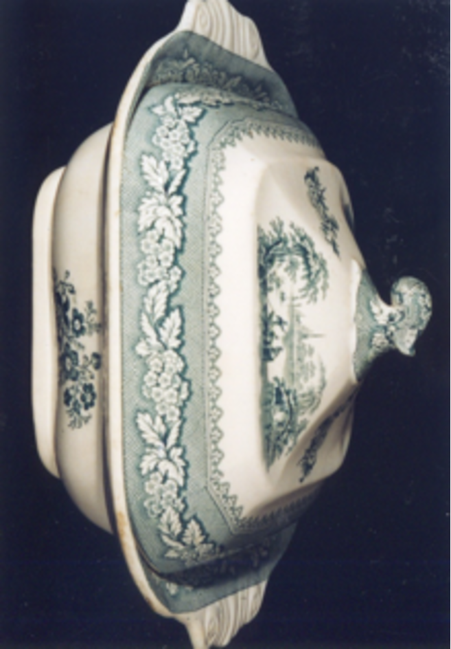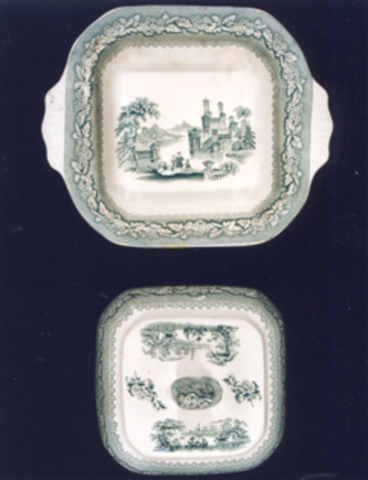 Fonte fonda, cadrada, con asas laterais labiadas con volutas en relevo e tapadeira. Decoración estampada en verde.