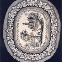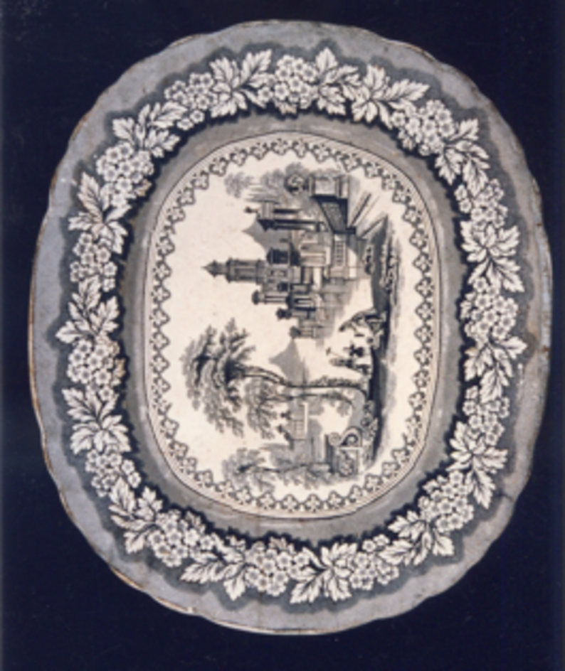 Fonte ovalada chaira co bordo con ondas e estampados en negro.