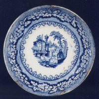 Prato pequeno de bordo liso con estampaxes en azul.