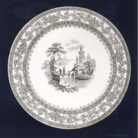 - Prato de sobremesa de bordo liso decorado con estampados en gris. O tema principal é unha viñeta con paisaxe imaxinaria romántica, cunha composición marcadamente escenográfica que se organiza en torno a un río en zig-zag, rochas, abundante vexetación. Unha ponte sobre a que hai dous personaxes con canas de pescar une os dous lados do río. Á dereita, edificios de altas torres rompen a horizontalidade e equilibra a composición unha árbore alta á esquerda; en último plano, edificios, unha embarcación a vela e montañas. Orla na á do prato a base de orla con uvas e follas de vide entre dúas pequenas orlas de encaixe.