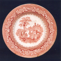 - Prato sopeiro con decoración estampada en rosa carmín. Tema principal: paisaxe imaxinaria cuxa composición se organiza en torno a un río en zig-zag. En primeiro plano, á esquerda, arbustos, rubideiras, abetos e en vertical, dúas grandes árbores. Á dereita, ruínas clásicas serven de pano de fondo a tres personaxes conversando. Detrás, sobre un promontorio, outeiros e un castelo medieval. Completa a decoración unha orla de flores e follas; na á do prato, sobre campo de rede e remate de cestaría.