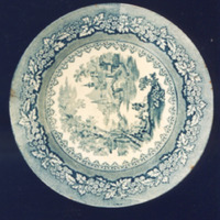 Decoración tipo viñeta con paisaxe imaxinaria. Composición organizada ao redor dun río en zig-zag. En primeiro plano, á esquerda, baixo unha característica árbore alta, un grupo de personaxes falando: unha muller sentada, un neno e dous homes de pé. Noutro plano, unha ponte une as dúas vertentes do río. Á dereita, pobo con casas e tellados de agulla.