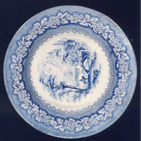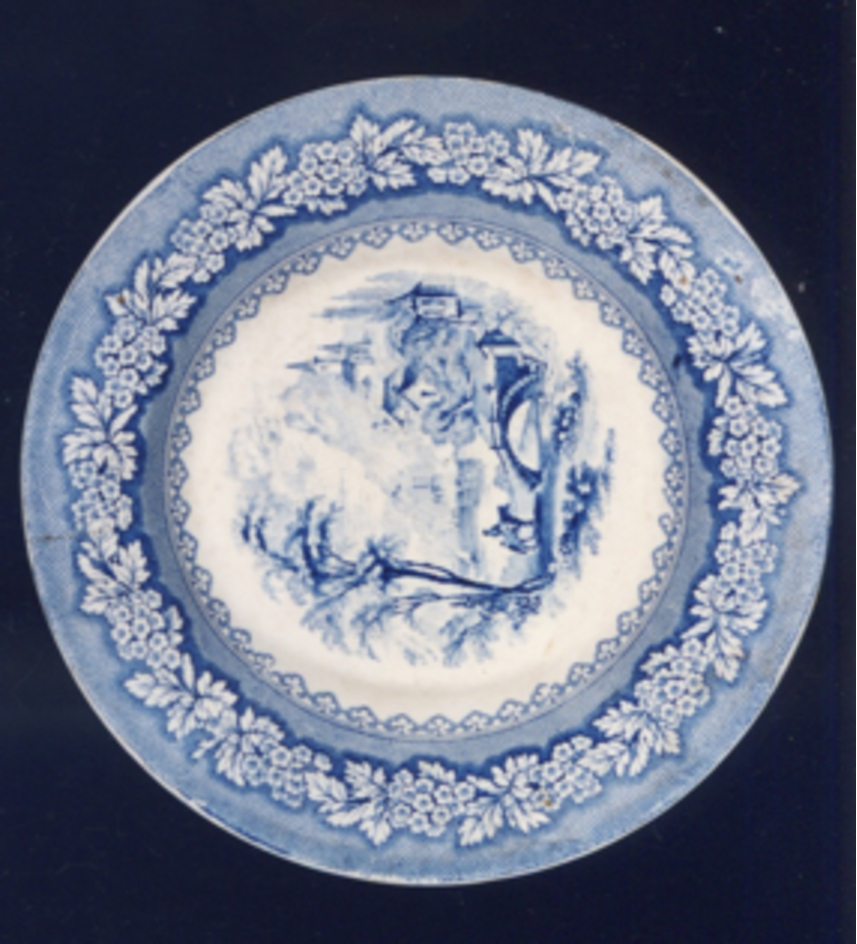 Prato sopeiro de bordo liso con decoración estampada en azul.