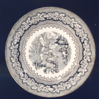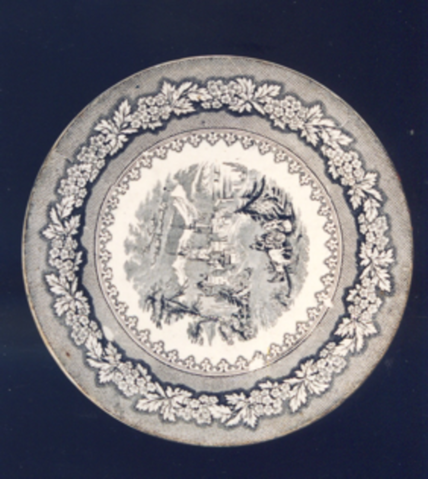 Prato chairo de bordo liso e decoración estampada en negro.