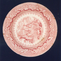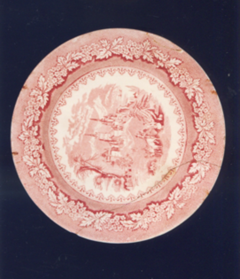 O tema principal é unha viñeta con paisaxe ideal, de estilo centroeuropeo, coas súas rochosas montañas e os seus lagos. En segundo plano, edificacións de tellados puntiagudos e en primeiro, carreta de bois con dous personaxes; ao seu lado, parella que lembra ao popular grupo: "Mariquita ponte o manto e Martín Garabato", a cuxo lado aparecen unhas pezas de louza. Nas guardillas, cenefa vexetal a base de inflorescencias alternando con follas e remate de cestería.