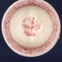 Cunca de té, co asa rota. Decoración con estampados en rosa. O tema principal: viñeta con paisaxe imaxinaria, caracterizado pola presenza de dous cisnes afrontados, repítese dúas veces no bandullo e un detalle do mesmo no fondo.