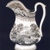 - Xarra de lavabo de base poligonal decorada con estampacións en negro. O tema principal, que se repite dúas veces no bandullo: trátase dun xardín romántico no que pasean dúas damas e un cabaleiro. Abundante vexetación, en primeiro plano aparece un carro e un can "dogo" co seu colar. Valos, ponte e edificio (casa medieval). Pecha a composición un pano de montañas. En bezo e rebezo ancha orla con flores sobre campo de tule e remate, no colo, de cestaría; este mesmo dáse no pé e a asa.