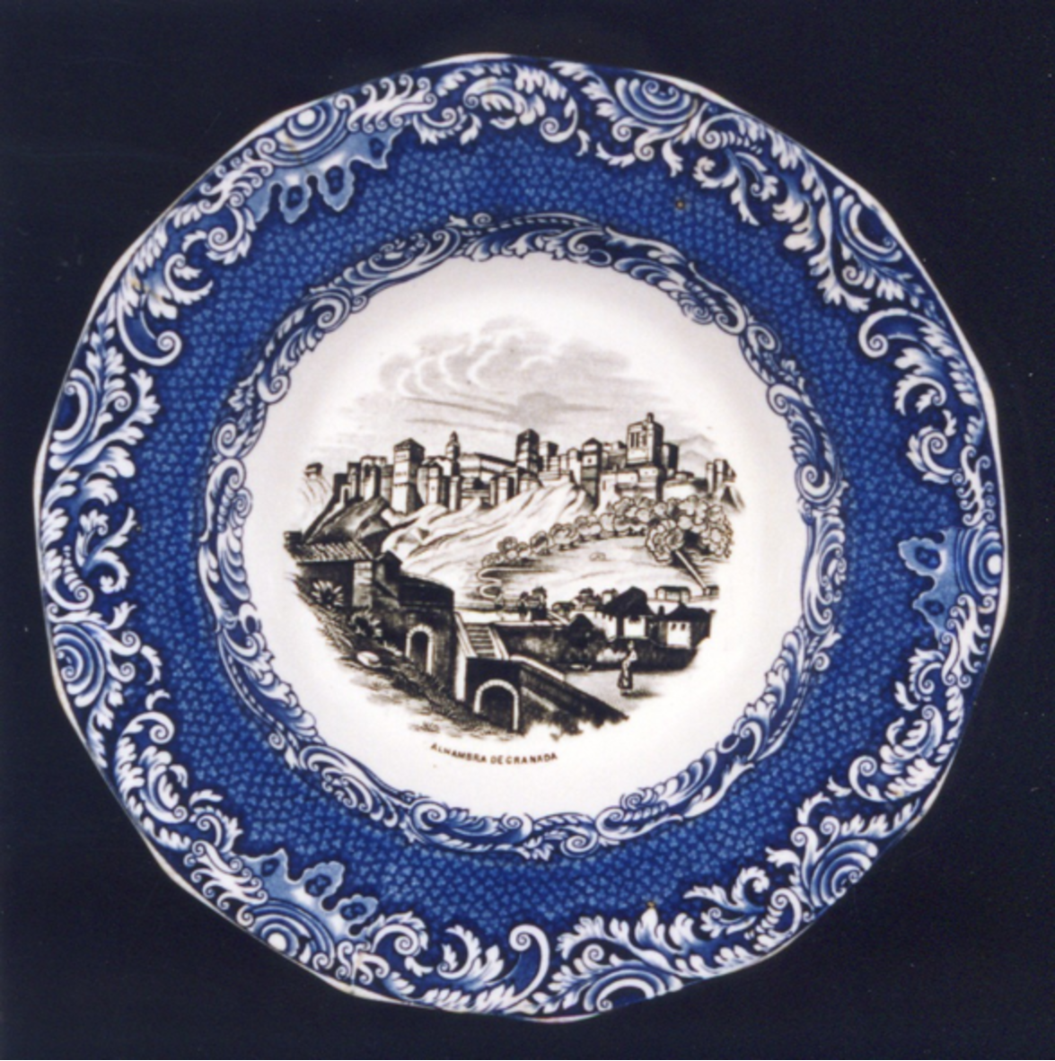 - Prato sopeiro, de bordo poligonal e decorado con estampados en dúas cores. O tema principal, en negro, é unha vista real de Granada. Debaixo unha inscrición "Alhambra de Granada". Posiblemente foi sacada dalgunha ilustración. Nas bufardas a decoración é en azul cobalto e consiste en dúas orlas de roleos e cardos separadas entre si por unha campo moteado. Esta decoración é copiada da fábrica inglesa " Copeland & Garret".