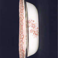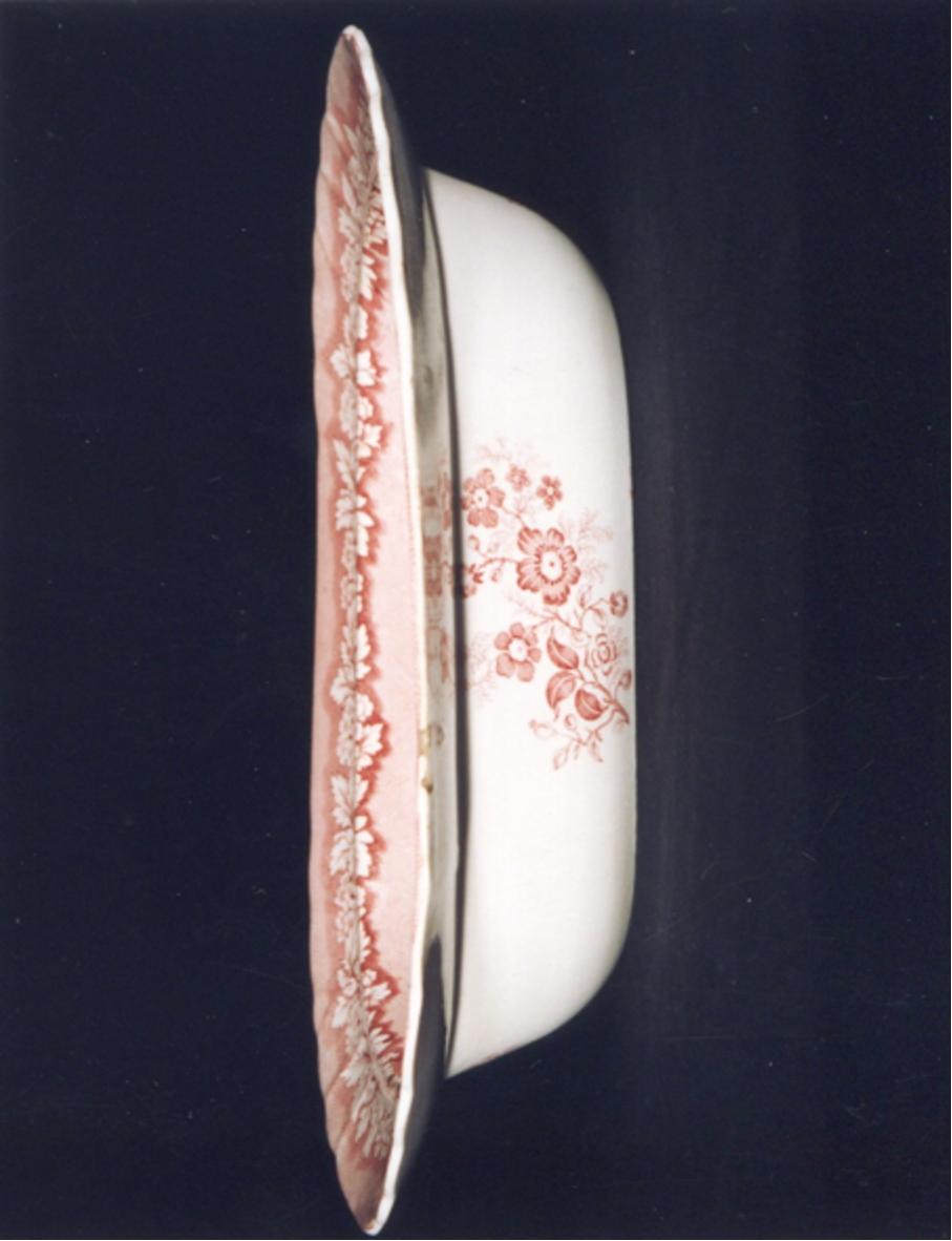 - Fonte ovalada, fonda, co bordo de ondas e decoración estampada en rosado. O tema principal localízase no centro e é unha gran viñeta con paisaxe realista (aínda que poida ter elementos ficticios). Altas árbores vitorianas en primeiro termo. Nas bufardas, orla floral sobre banda de tul e remate interior en cestaría. Pola parte externa, decorado a base de catro ramitos de rosáceas, un en cada lado.