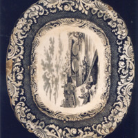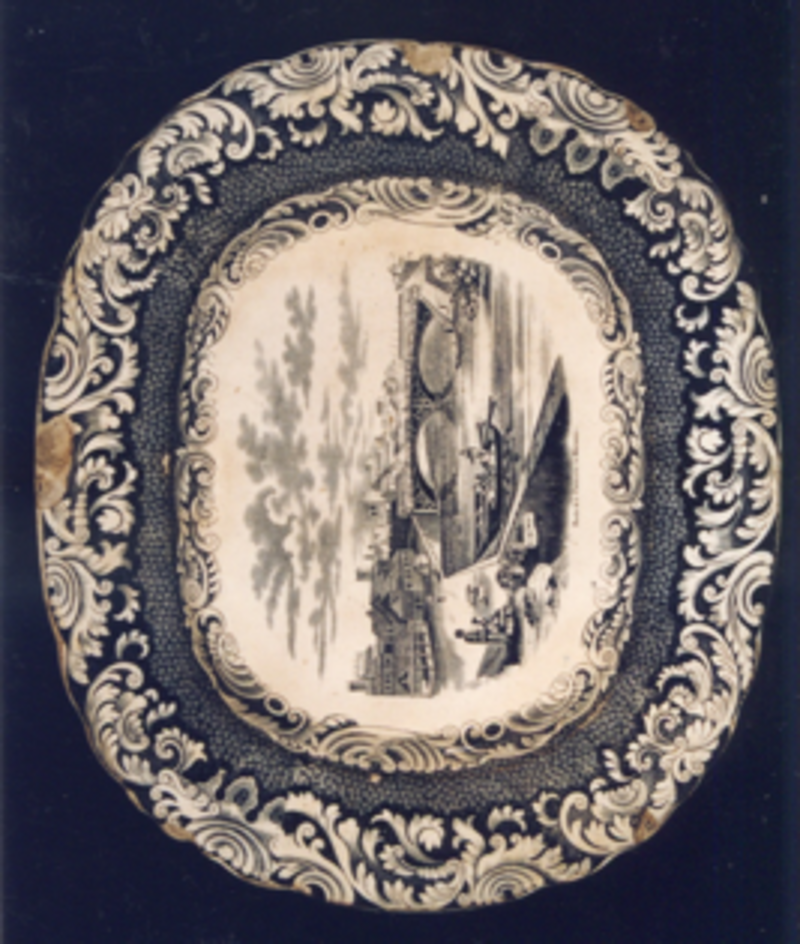 Fonte ovalada con bordo de ondas e decoración estampada en negro.