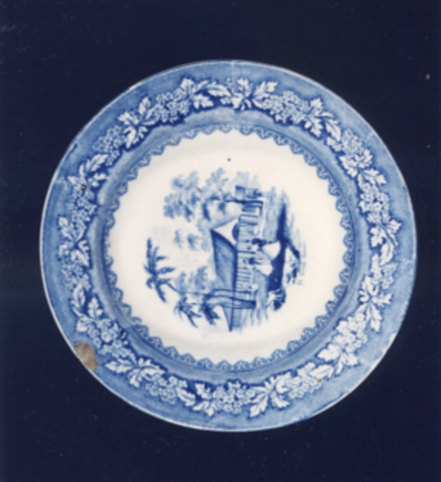 Prato sopeiro de bordo liso e decoración estampada en azul.
