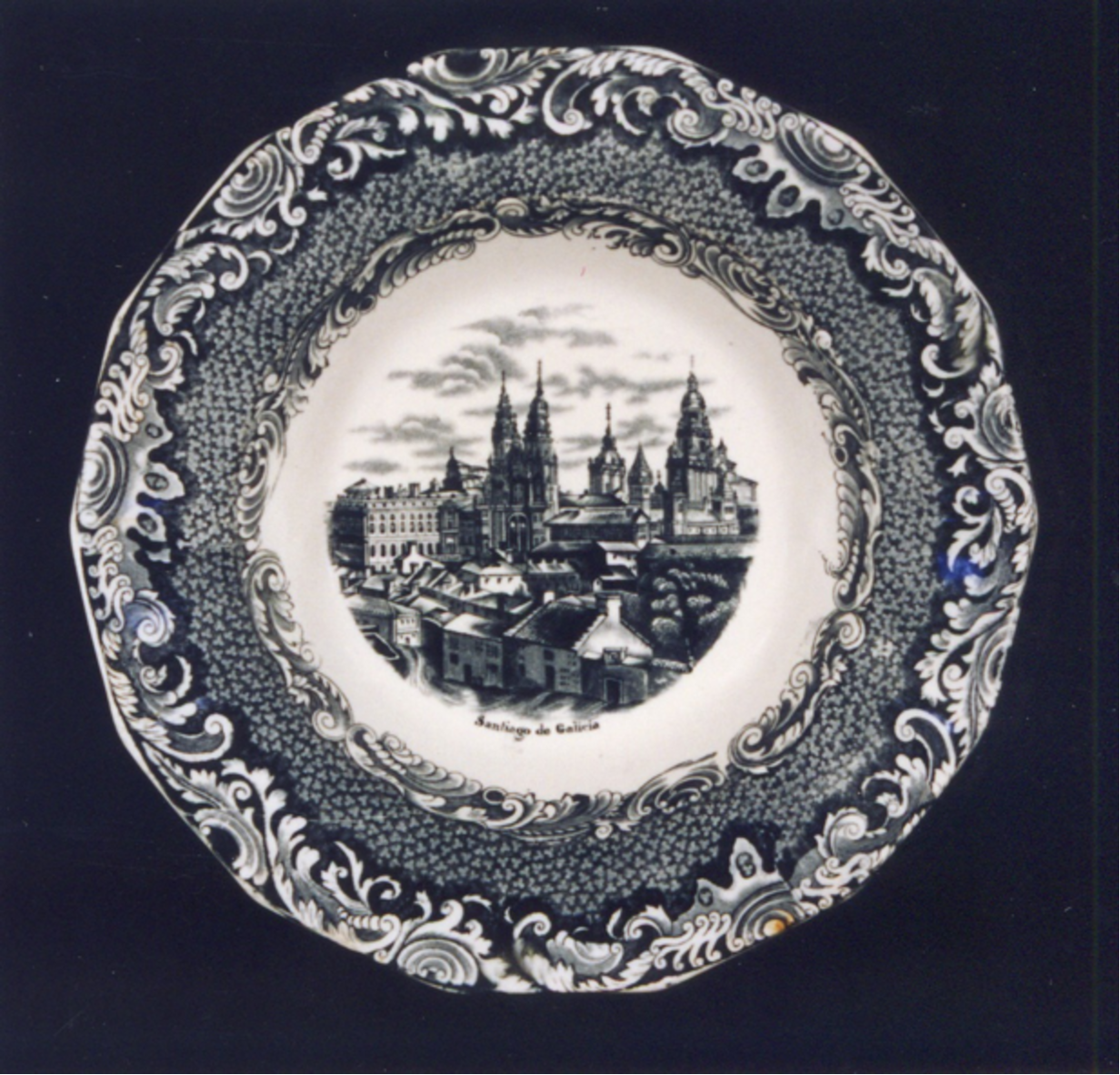 O tema principal, no centro, é unha viñeta cunha característica vista de Santiago de Compostela dende a Alameda. Debaixo: "Santiago de Galicia".