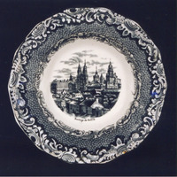 Completa a decoración nas bufardas, dobre orla de roleos e cadros separados por un campo moteado. Esta decoración foi copiada de modelos da fábrica inglesa "Copeland & Garret " (1833).