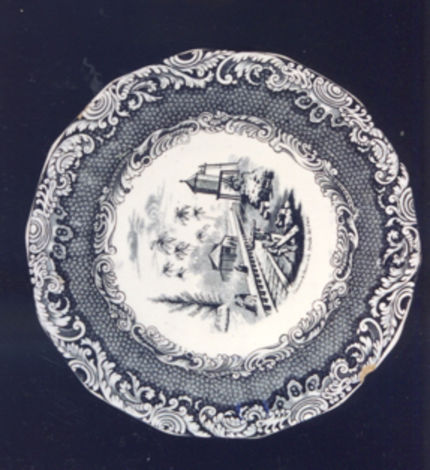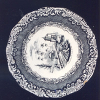 Prato chairo con bordo de ondas e estampaxes en cor negra.