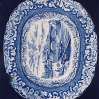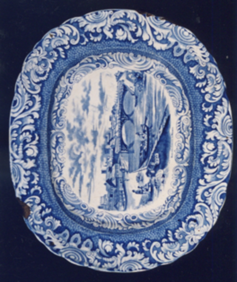 Fonte ovalada con bordo de ondas e completamente decorada con estampaxes en azul.