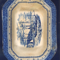 Completa a decoración unha ancha orla no bordo, con empedrados e roleos puntillados, rematada en encaixe e unha fina cenefa a base de rombos.