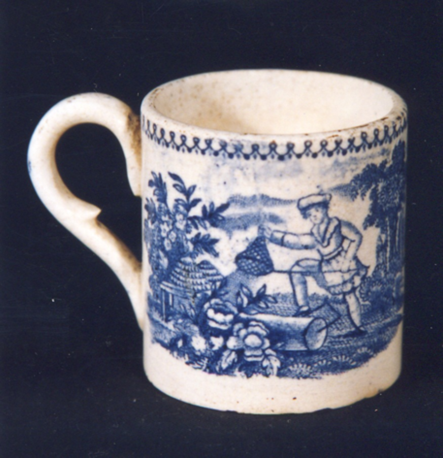 - Cunca para chocolate de forma cilíndrica e decoración estampada en azul cobalto. Temas principais: dúas viñetas con temas infantís; un dos temas é un neno con cazabolboretas, ao lado de dous favos de abellas. Como fondo: referencia espacial dun xardín ou bosque, con árbores, plantas... Na boca, puntilla finita.