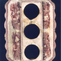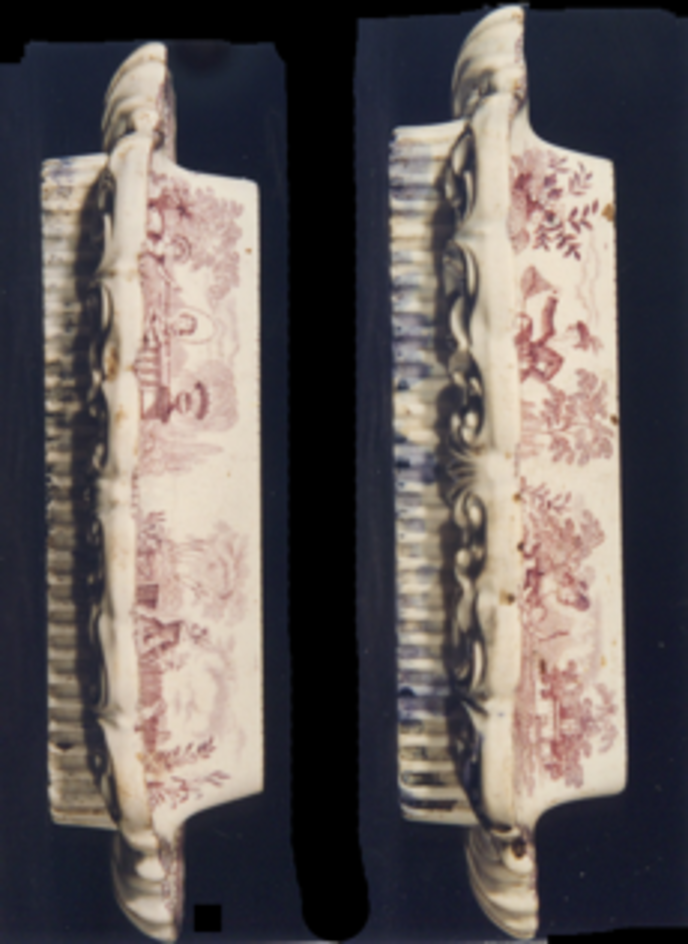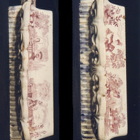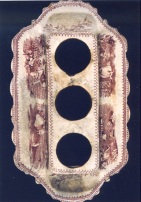 - Escribanía á que lle faltan os tres recipientes, tinteiros e salvadeira, é de forma alongada con remates de cuncha nos lados menores, relevos de roleos na parte inferior e na superior decoración estampada en tons lilas que representan temas infantís; nun lado viñetas: "nenas saltando á corda" e "nai e nena collendo flores". No outro lado: "mamá con bebé xogando con can" e "neno con cazabolboretas". Nos lados menores, campanillas. Bordea a peza un remate de encaixe.