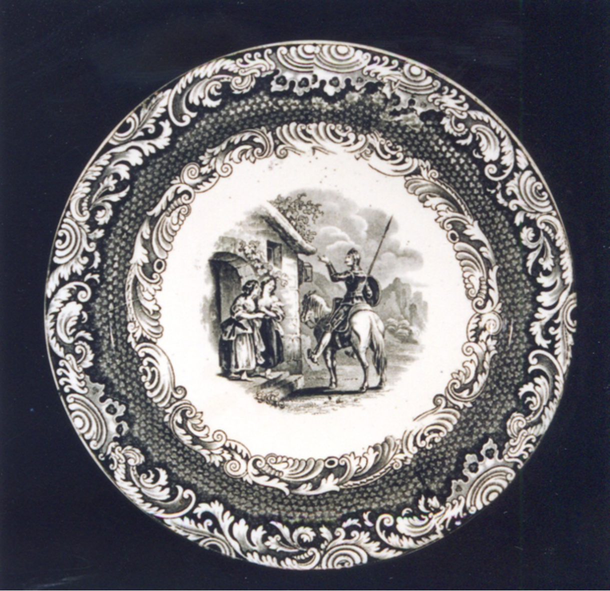 Prato de sobremesa con decoración estampada en negro. O tema principal é unha viñeta cunha ilustración do capítulo II do Quixote que trata da primeira saída que da súa terra fixo o enxeñoso D. Quixote: "... chegouse á porta da venda e viu as dúas distraídas mozas que alí estaban, que a el lle pareceron dúas fermosas doncelas e dúas graciosas damas que diante da porta do castelo se estaban a solazar... ".
