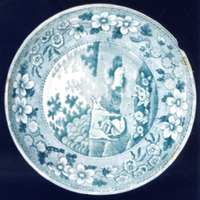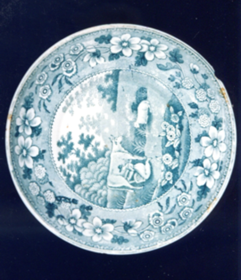 A decoración cobre a totalidade do prato: o motivo principal, que ocupa o centro, é unha escena campesiña na que aparece unha muller ordeñando unha vaca. Ao seu lado, dúas ovellas. A escena desenvólvese nun espazo ao aire libre nun campo con flores, árbores e pequenas montañas de fondo.