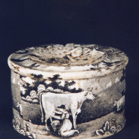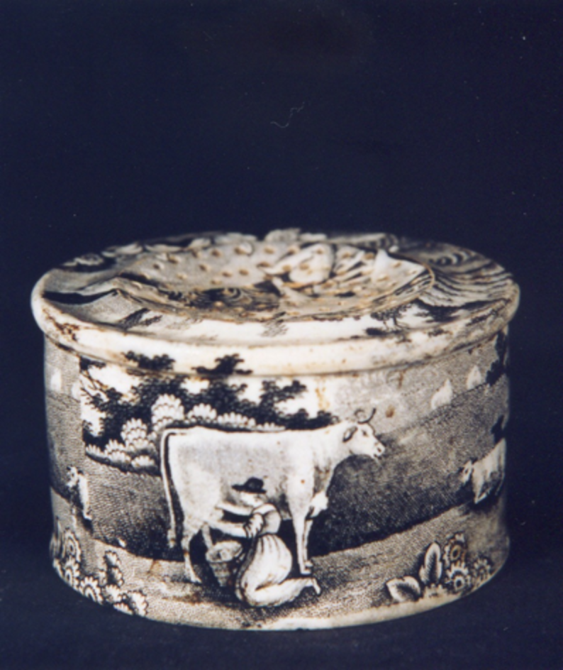 O motivo principal ocupa todo o recipiente e trátase dunha orla na que se repite unha mesma imaxe: o dunha muller muxindo unha vaca, ao seu lado dúas ovellas e campo detrás.