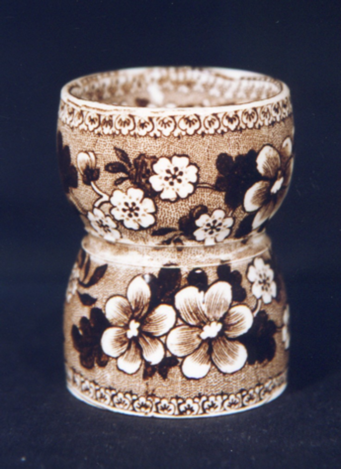 - Oveira de dúas bocas (podía usarse indistintamente). Presenta decoración estampada en cor marrón a base de dúas orlas de flores silvestres: unha arriba e outra abaixo sobre campo sombreado, logrado a base de infinidade de puntos. Na parte interna as mesmas orlas e no bordo de ambas as dúas bocas remate puntillado.