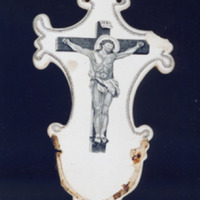 Trátase dunha prancha en forma de cruz con dous orificios para ser colgada na parte superior e en pico na parte inferior. Estampada en negro a figura de Xesucristo na cruz, cravado con catro cravos e tapado co pano de pureza.