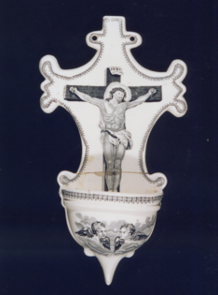 Na pileta dúas cabezas de anxos entre nubes. Polo bordo, fina tira de encaixe en negro.