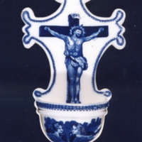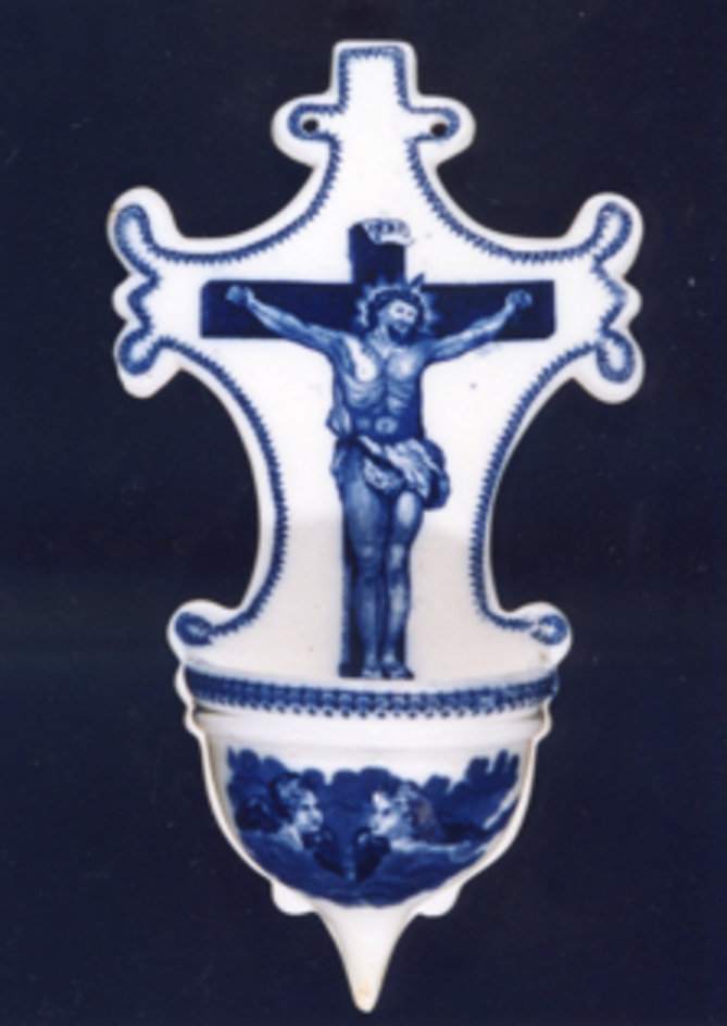 Pila en forma de cruz con decoración estampada en azul cobalto. Na parte superior, dous orificios para ser colgada.