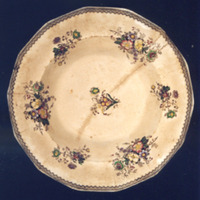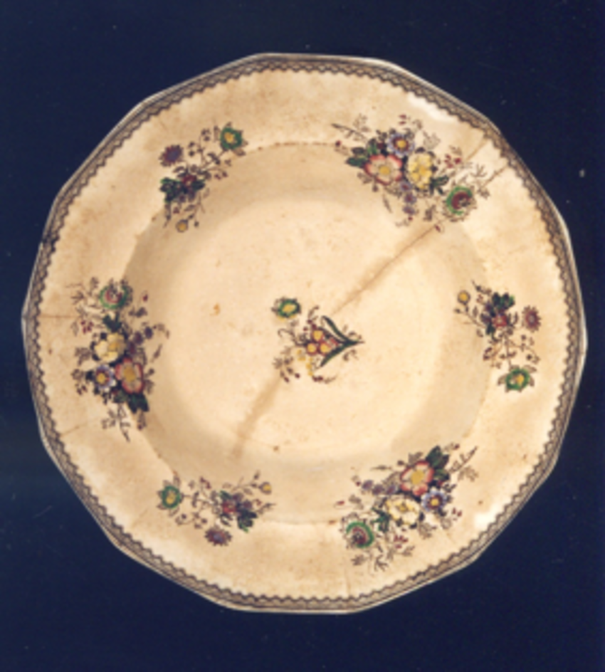 Diseminados pola superficie do prato, pero colocados simétricamente, distribúense sete ramitos de flores, alternando uns máis grandes con outros pequenos. As flores que os compoñen son rosáceas, herbáceas e flores da paixón. O estampado é marrón pero están coloreadas con rosa, verde, azul e amarelo.