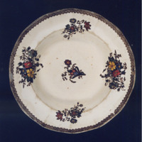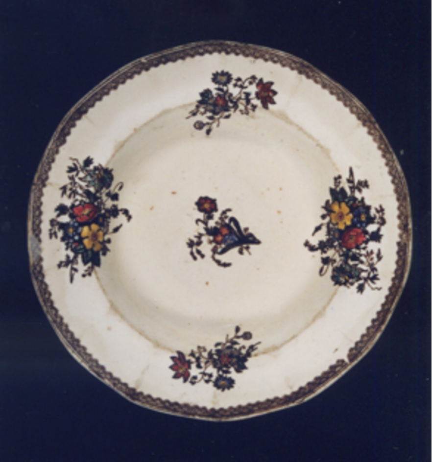 - Prato sopeiro de bordo poligonal. Decoración estampada en marrón: no bordo, cenefa con alternancia de rosetas e perlas. Diseminados pola superficie do prato pero colocados simétricamente distribúense cinco ramitos de flores variadas (rosáceas, flores da paixón) debuxadas en marrón, iluminados delicadamente con brillantes cores: amarelo, verde, azul e vermello rosa.