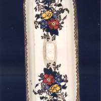 Agarradoira no centro, alongada con relevo floral. A ambos os dous lados, ramos de flores idénticos, estampados en marrón escuro con rosáceas e flores da paixón en vermello e azul. No bordo: cenefa de rosetas alternando con perlas sobre campo punteado.