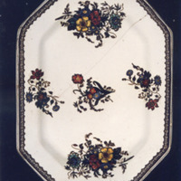 Sobre a superficie repártense ramos de flores simétricamente: dous máis grandes nos lados menores consistentes en rosáceas vermellas e amarelas, flores da paixón verdes e outras pequenas azuis. Nos lados maiores, outros dous ramos máis pequenos compostos das mesmas flores máis campanillas. No centro, outro. Bordo: cenefa de rosetas e perlas.