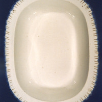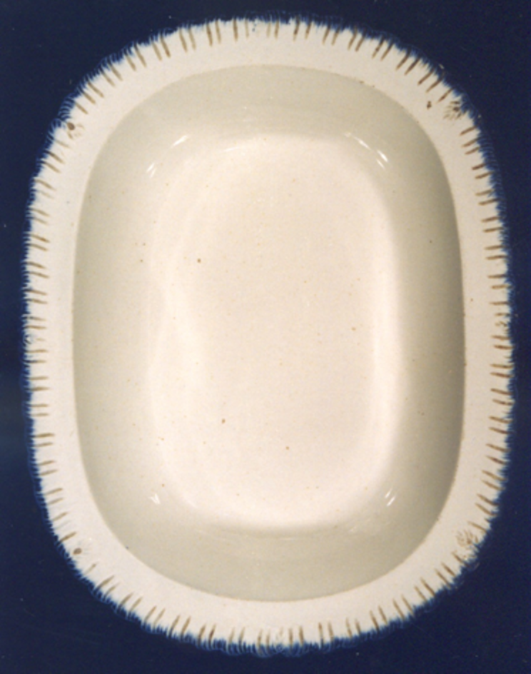 - Fonte fonda e ovalada. Bordo con decoración en relevo de surcos. No extremo filete azul cobalto pintado a pincel, e irregular.