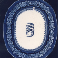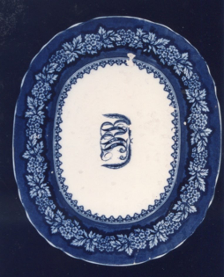 Fonte ovalada chaira con bordo de ondas e decoración estampada en azul.