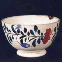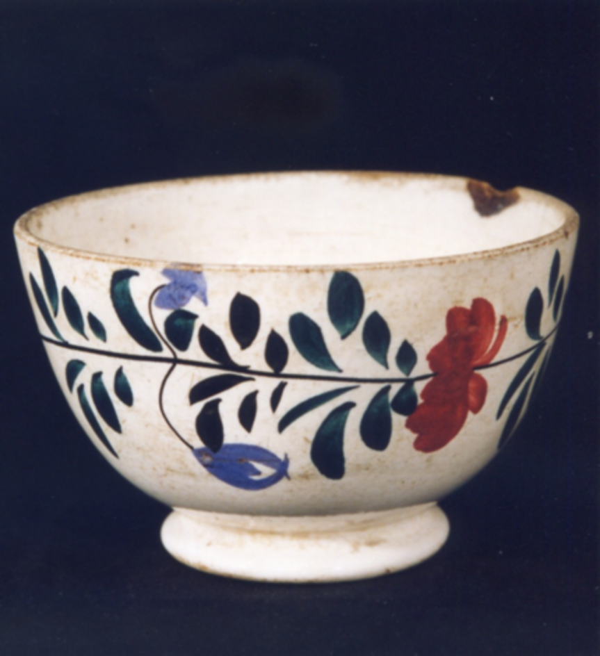 - Tazón ou cunco sen asas. Decoración pintada de tipo floral consistente nunha grilanda ou orla que ocupa case a totalidade do cunco, formada a base de clavelones vermellos feitos a base de trazos soltos con pincel, unidos entre si por segmentos de fino talo negro do que parten esquemáticas follas e a intervalos regulares capullos azuis; un destes capullos azuis, illados, aparece no fondo do cunco.
