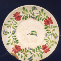 - Pratiño liso fondo para cunca de almorzo. Decoración pertencente á serie floral. Neste caso o motivo principal é o que ocupan as guardillas: cenefa grande a base de flores vermellas que poderían ser chavelones ou peonías unidos entre si por un fino talo negro con follas verdes e capullos azuis. No centro, pequena poliña con dúas follas e un capullo azul. Todo o debuxo conséguese a base de pinceladas soltas cargando máis ou menos as tintas para dar volumes.