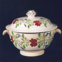 Forma redondeada con dúas asas laterais en forma de cuncha e tapadeira con pomo con relevos: tanto estes como os das asas foron seguidos polo pintor con trazos en negro marcando ben os debuxos do relevo.
