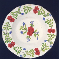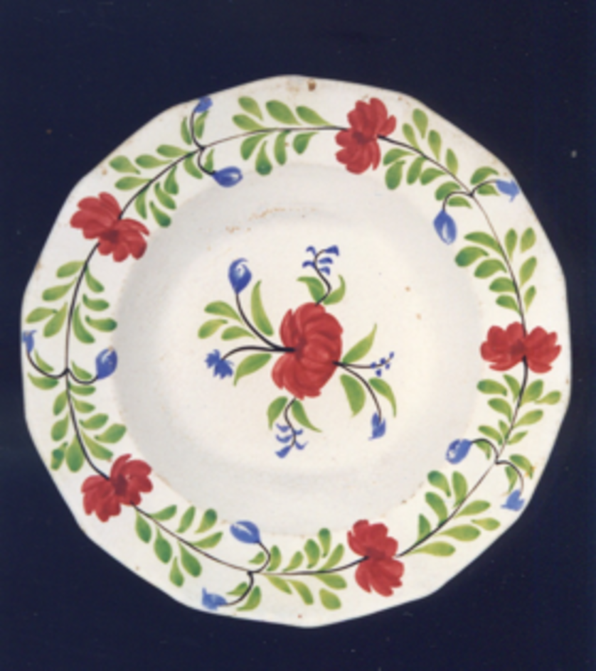 Prato sopeiro con bordo poligonal. O tema central é un caravel grande ou mapoula en vermello intenso con finos talos negros e capullos azuis.