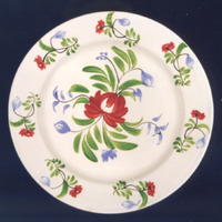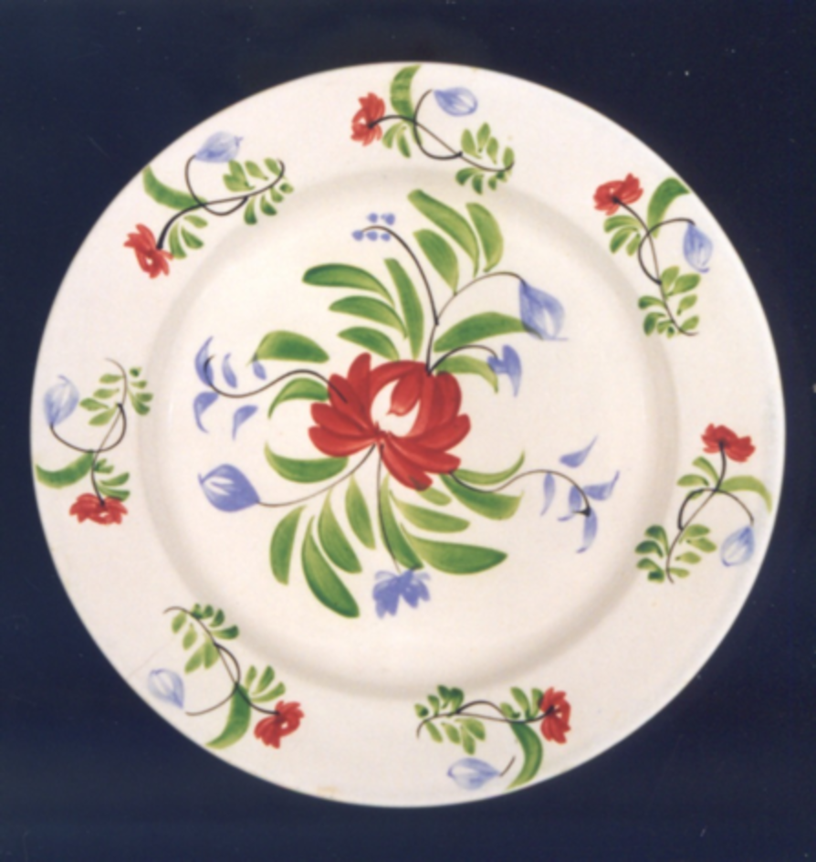 Prato chairo de bordo liso. Decoración pintada de carácter floral consistente nun motivo central de gran tamaño que é unha especie de rosa ou peonía realizada en vermello-carmín, a base de grandes e soltos trazos, da que parten en cruz unhas ramas negras con follas e capullos azuis.